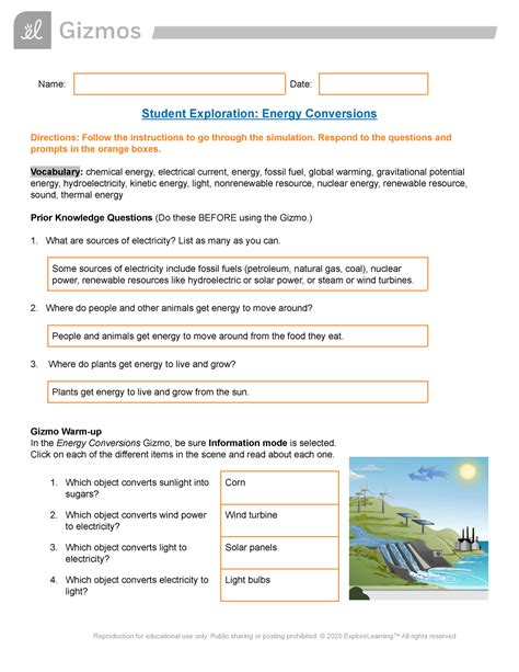 Student Exploration Energy Conversions Answer Sheet Answers Pdf